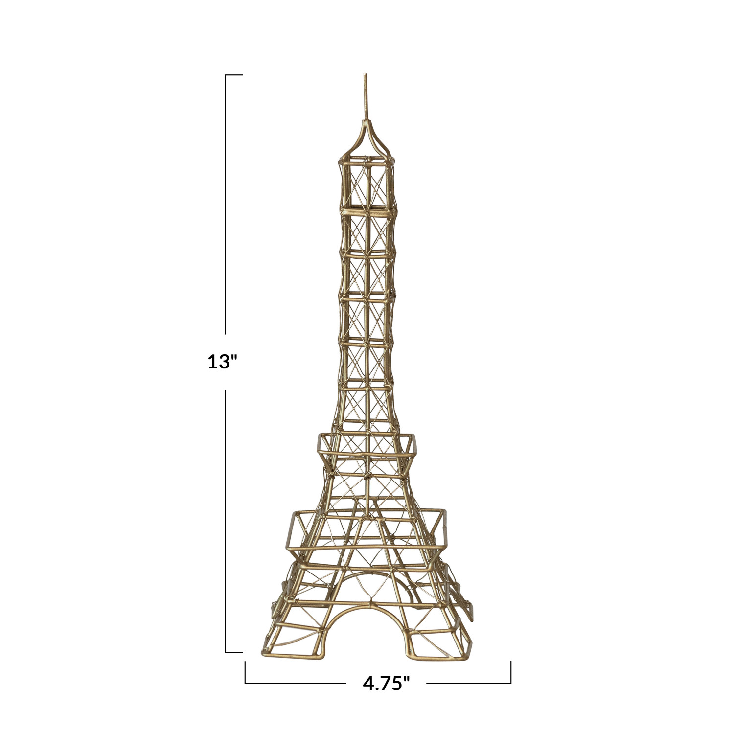 This wire Eiffel Tower is a beautiful and convenient way to decorate the home. It features a stunning wire Eiffel Tower with an antique brass finish that gives it a vintage and elegant look, making it look like a miniature replica of the iconic landmark. The Eiffel Tower has an intricate and graceful shape that is pleasant to touch and look at. The Eiffel Tower is a refined and romantic piece that can evoke the charm and beauty of Paris in any style, from French to bohemian. It is ideal for adding some sophistication and culture to the home, where it can make any space feel more classy and chic. The Eiffel Tower is made of metal that is durable, smooth, and easy to clean. It measures 4.75 inches in length, 4.75 inches in width, and 13 inches in height, making it a noticeable and attractive accessory. This is a perfect choice for anyone who loves vintage and elegant home decor. A stunning wire Eiffel Tower with an antique brass finish that gives it a vintage and elegant look. A refined and romantic piece that can evoke the charm and beauty of Paris in any style, from French to bohemian. Ideal for adding some sophistication and culture to the home, this Eiffel Tower can be displayed on a side table, a dresser, or a vanity.