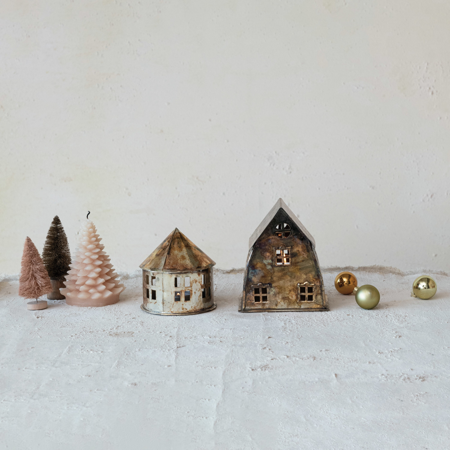 Catalog Name: 4-1/4" Round x 4-1/4"H Metal House Tealight Holder, Oxidized Silver Finish