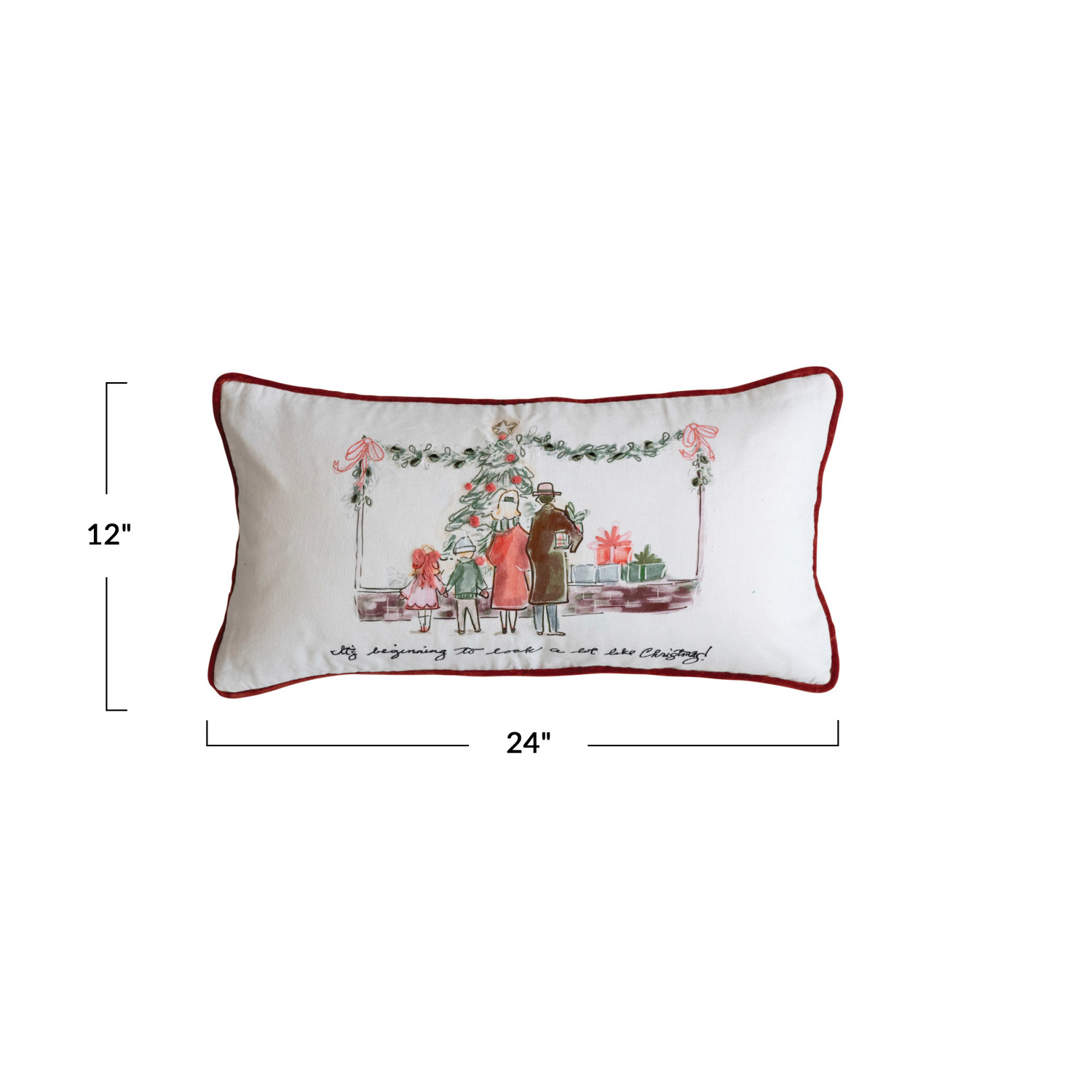 Catalog Name: 24"L x 12"H Cotton Printed Lumbar Pillow w/ Family, Piping & Velvet Back "It's Beginning To Look A Lot Like Christmas", Multi Color ©