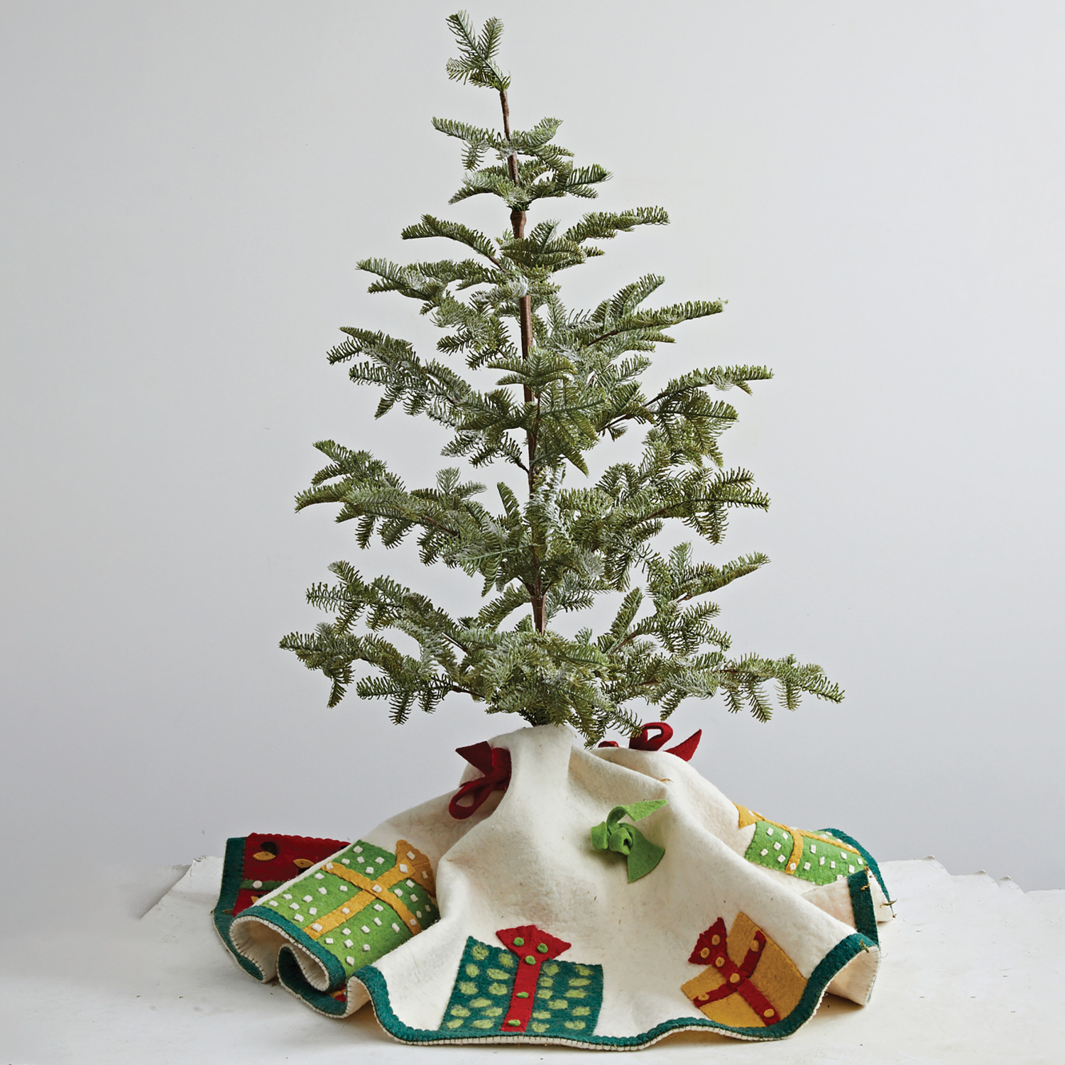 This festive wool felt tree skirt features intricately appliqued wrapped gifts and bows. Infuse any space with festive cheer and warmth with our luxurious collection of holiday textiles, including cozy stockings, spools of glittering sequins, sumptuous velvet ribbon, and more.