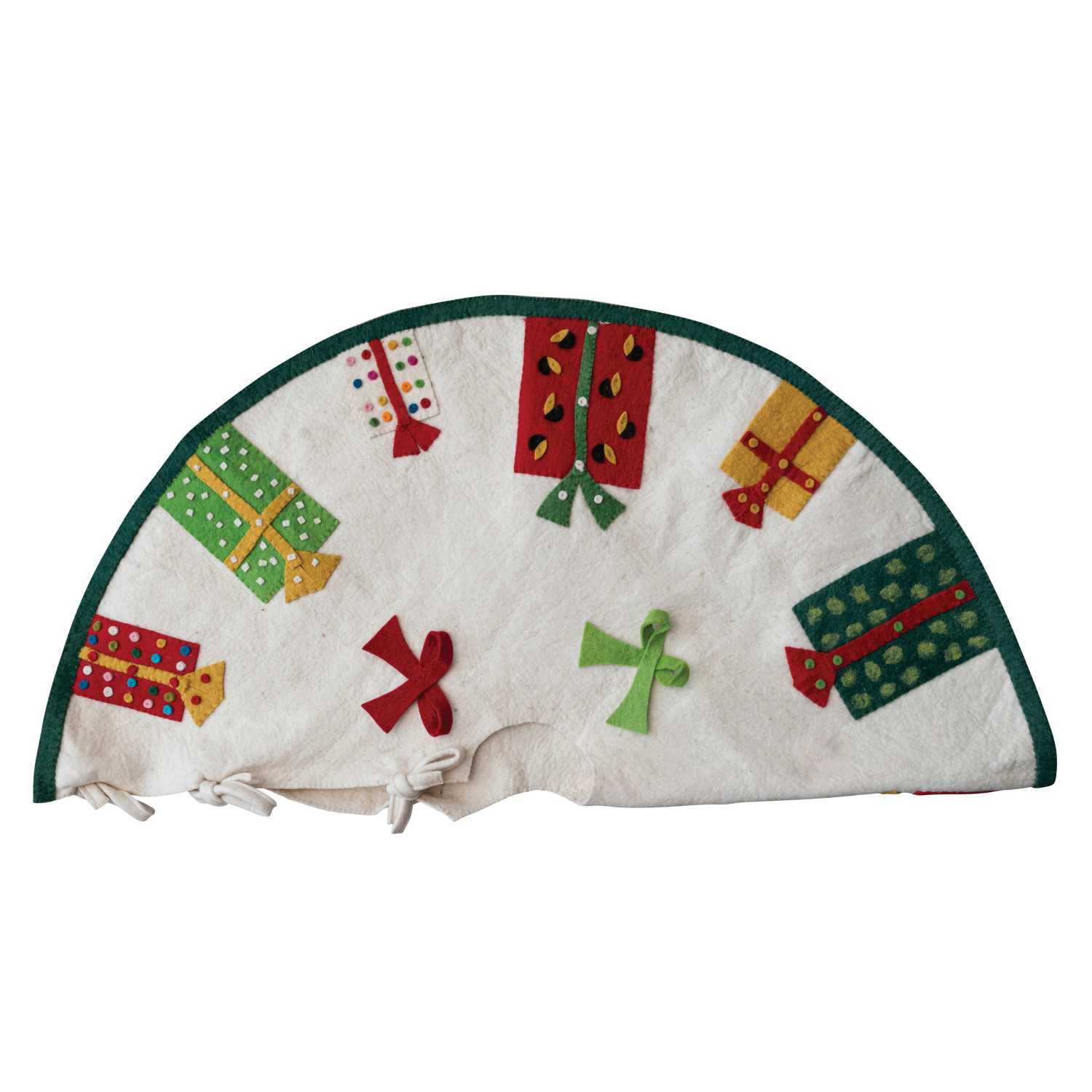 Catalog Name: 48" Round Handmade Wool Felt Tree Skirt w/ Appliqued Presents & Bows, Multi Color