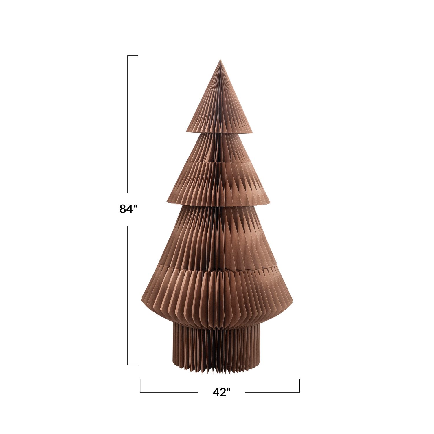This brown paper honeycomb tree is a beautiful and unique way to decorate for the holidays. It features a simple design that unfolds into a round shape with a pointed top, creating a three-dimensional effect. The tree has a rich and elegant brown color that matches well with any festive theme, whether it is natural, rustic, or modern. The tree is ideal for placing on a table, mantel, shelf, or window sill, where it can add a touch of charm and warmth to the space. The tree is also easy to fold and store, making it a convenient and reusable option. The tree is made of high-quality paper that is durable. It measures 42 inches in diameter and 84 inches in height, making it a noticeable and impressive centerpiece. This paper honeycomb tree is a wonderful choice for anyone who loves simple and elegant holiday decor. Elevate the holiday decor with this eye-catching Christmas tree, adding both style and a touch of whimsy. A stunning paper honeycomb tree in brown that unfolds into a round shape with a pointed top. A perfect addition to any festive decor, this brown tree complements natural, rustic, or modern themes. Ideal for displaying on a table, mantel, shelf, or window sill, this tree can be easily folded and stored for next year.