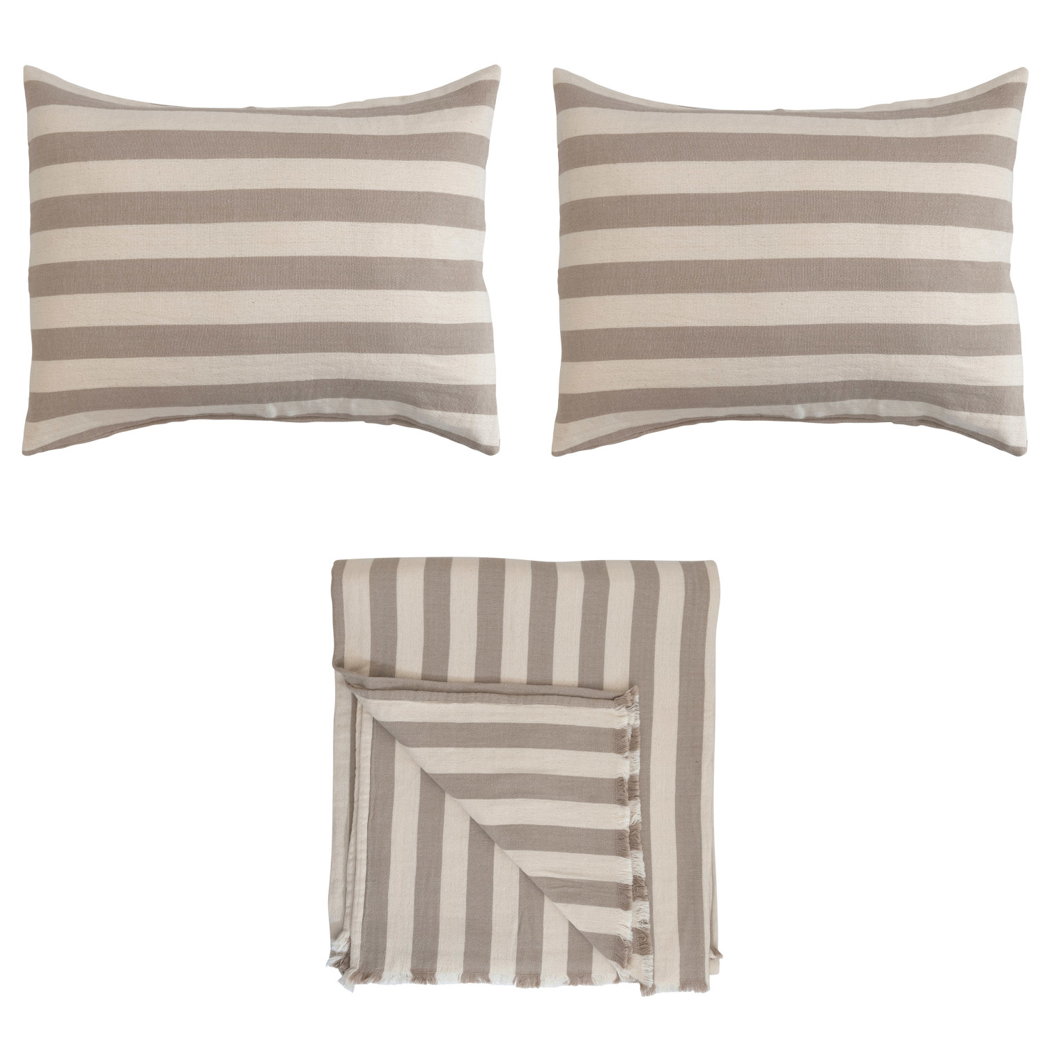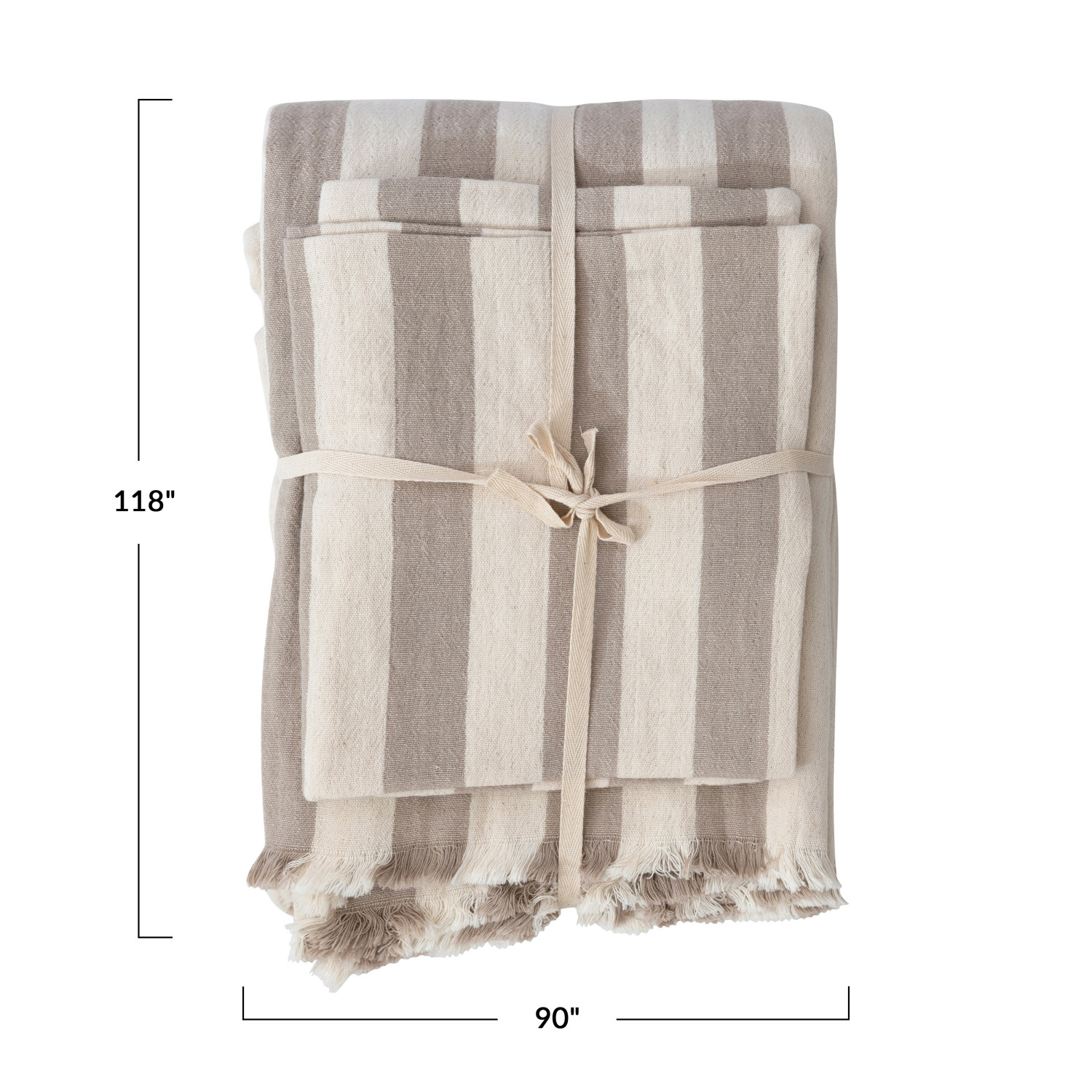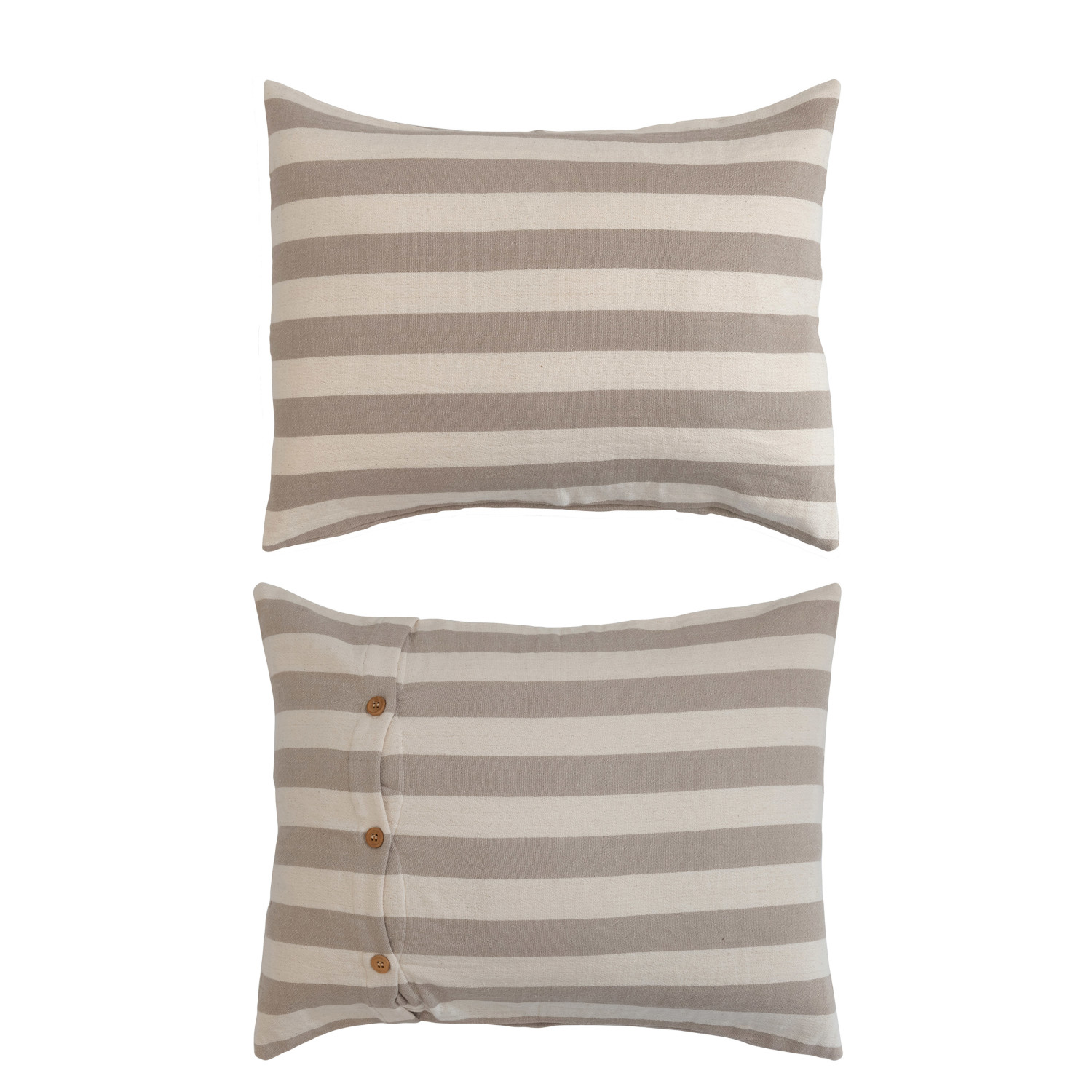 Catalog Name: 118"L x 90"W Cotton Double Cloth Bed Cover w/ Stripes & 2 King Shams w/ Wood Buttons, King, Cream & Tan Color, Set of 3 Tied w/ Cotton Tape