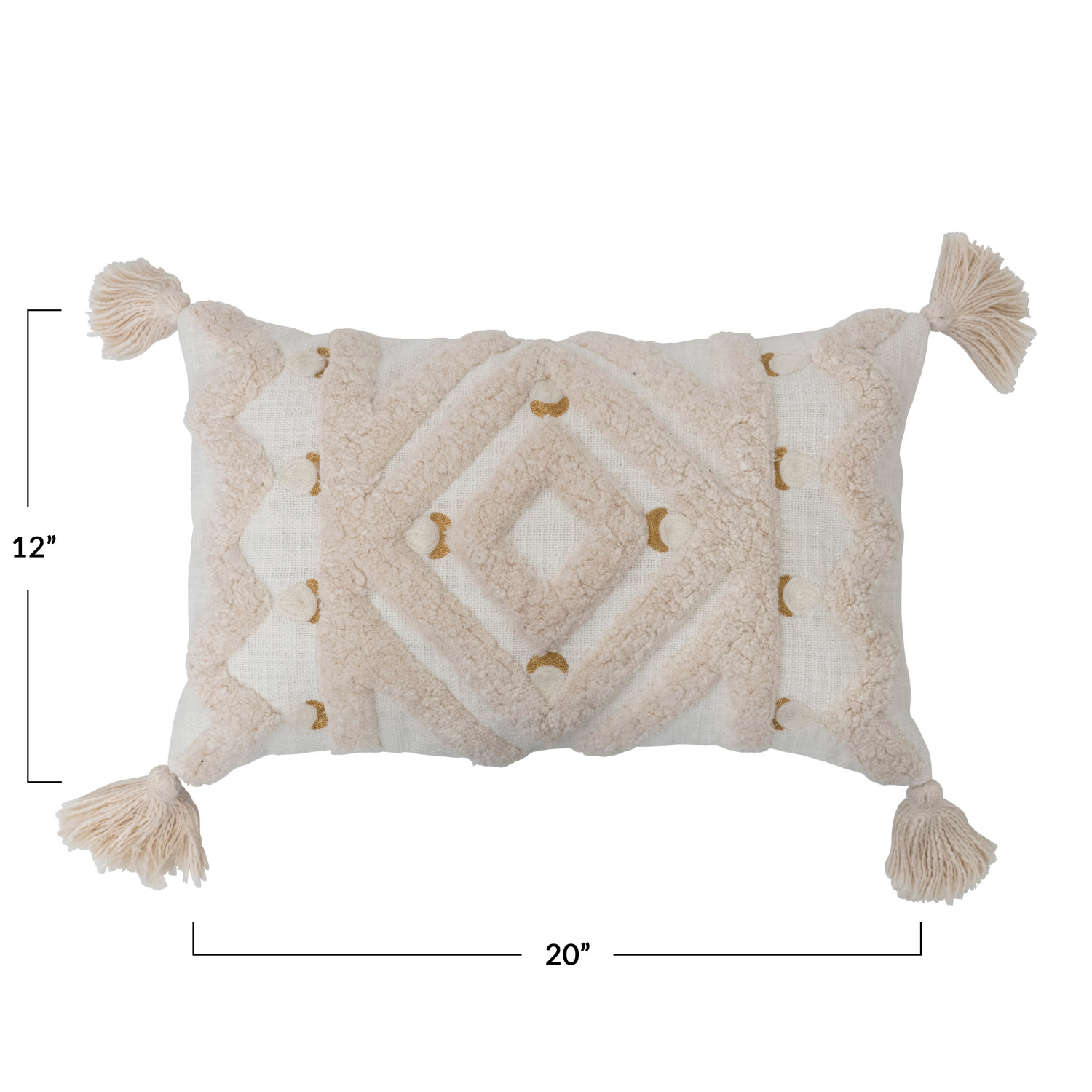 Catalog Name: 20"L x 12"H Cotton Tufted Lumbar Pillow w/ Embroidery & Tassels, Cream & Gold Color