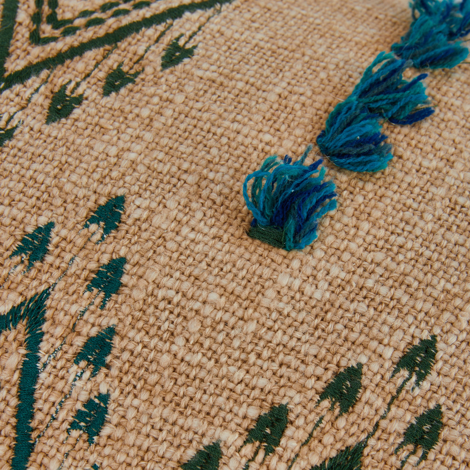 Cotton Slub Lumbar Pillow w/ Embroidered Pattern & Fringe, Natural & Teal