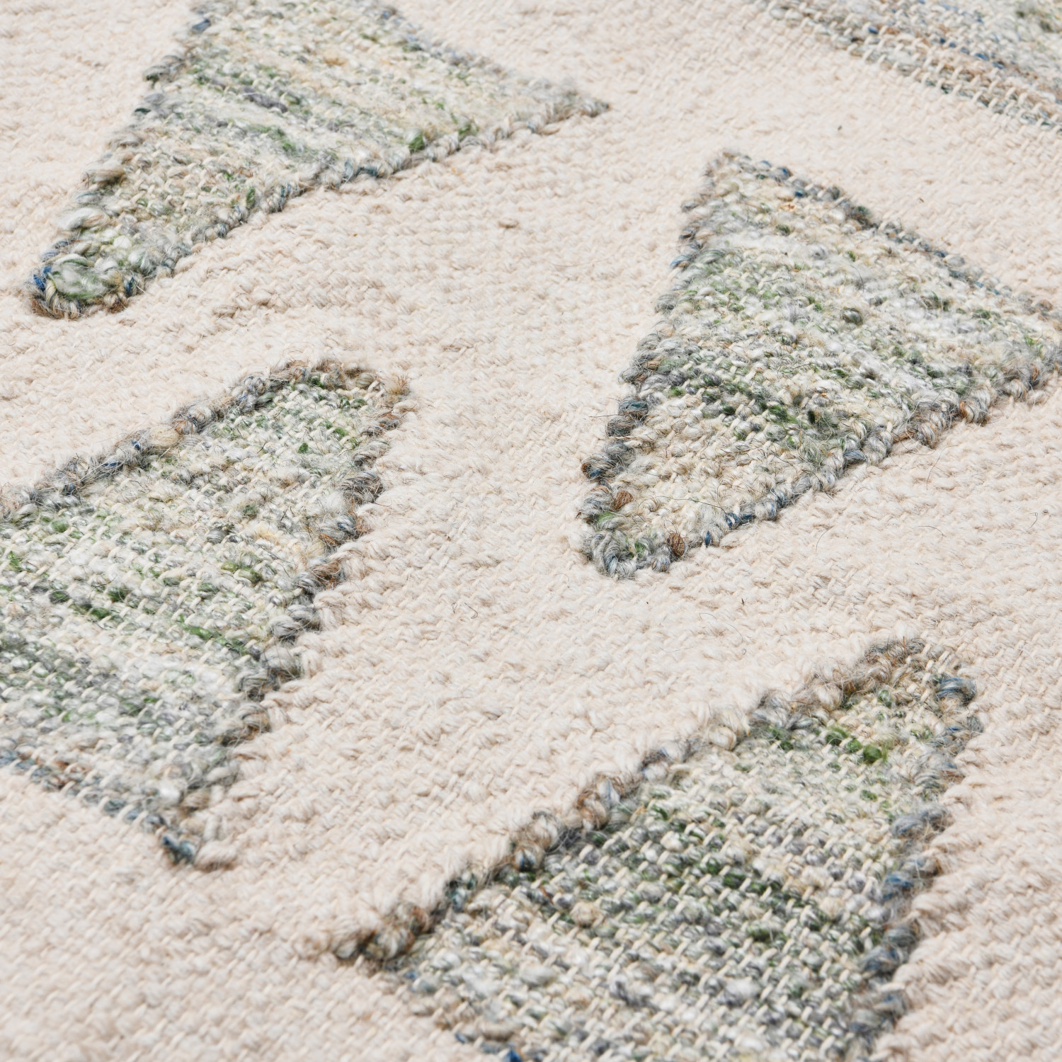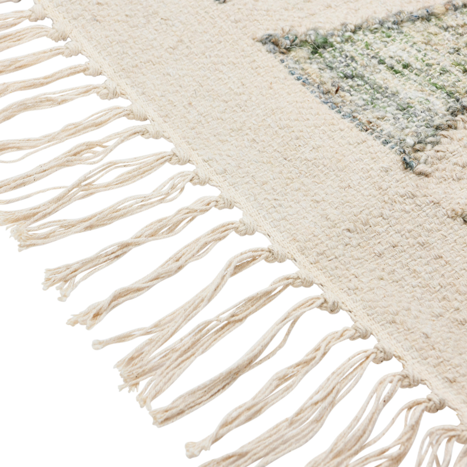 This small rug is perfect for any neutral home. Made out of hand-woven cotton and wool, this green and cream colored rug looks great in kitchens, hallways, and under desks. This rug instantly elevates any space and brings detail to any floor. Spot Clean Only.