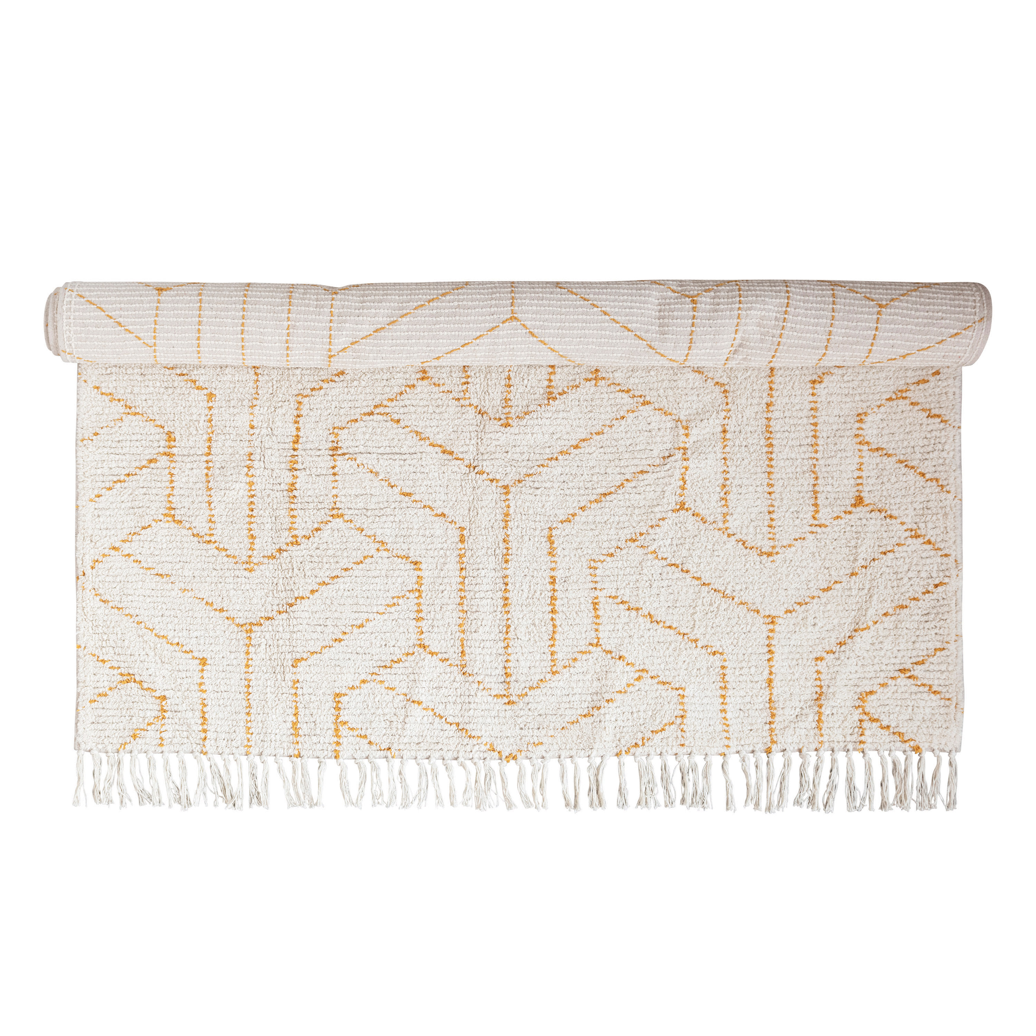 This boho-inspired rug features soft, tufted cotton construction with a stonewashed geometric pattern, finished with decorative fringe. Ivory and mustard tufted cotton rug with stonewashed geometric pattern and fringe. Spot clean only. Made from 100% cotton blend.
