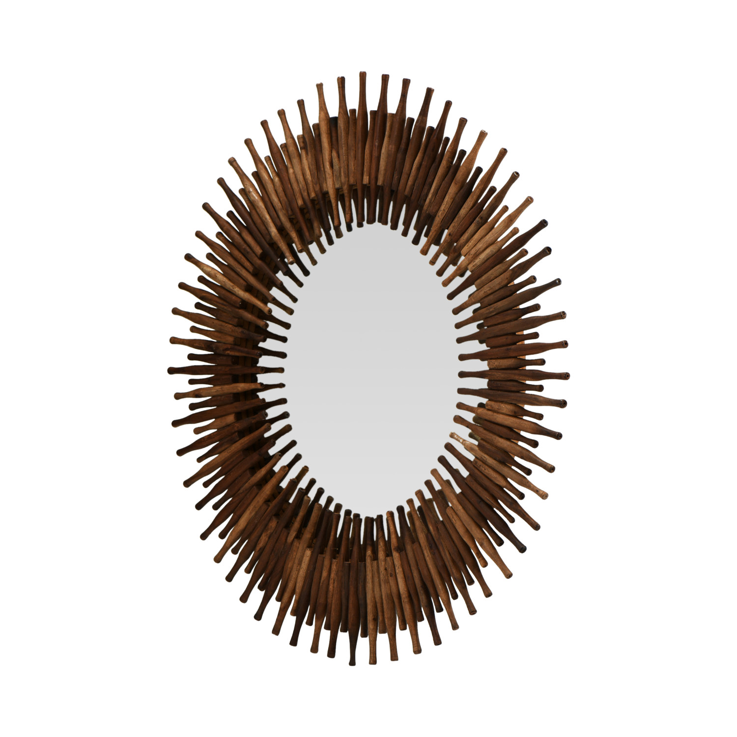Individual wood pieces create the frame of this mirror. There are short wood pegs with longer pegs surrounding each of the smaller ones. The wood has a variety of shades and shadows making an amazing decorator piece.