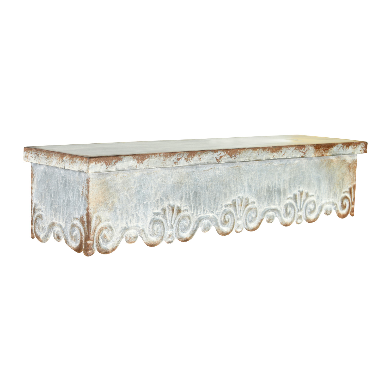 Catalog Name: 33-1/2"W x 8-1/4"D x 5-1/2"H & 23"W x 6"D x 5-1/4"H Metal Wall Shelves w/ Scalloped Edge, Distressed Zinc Finish, Set of 2