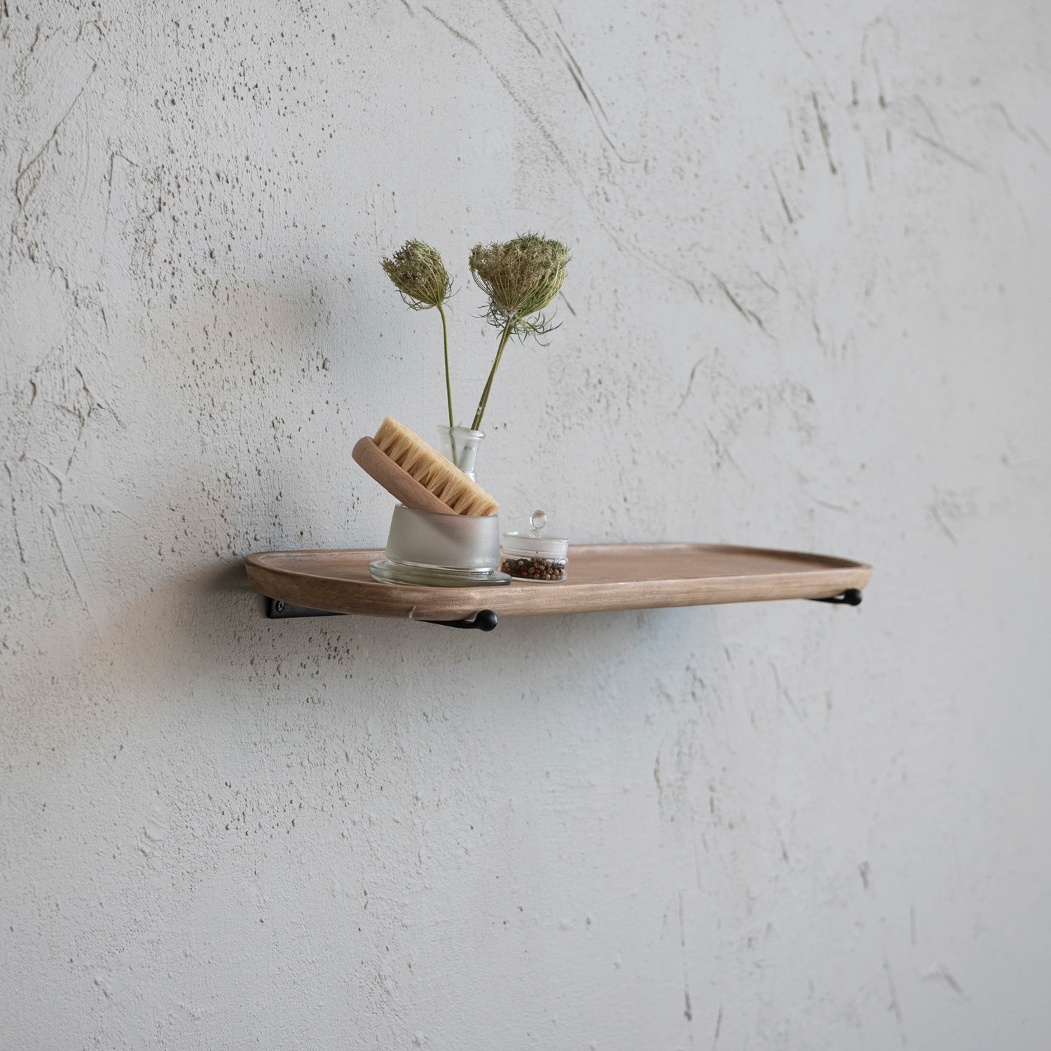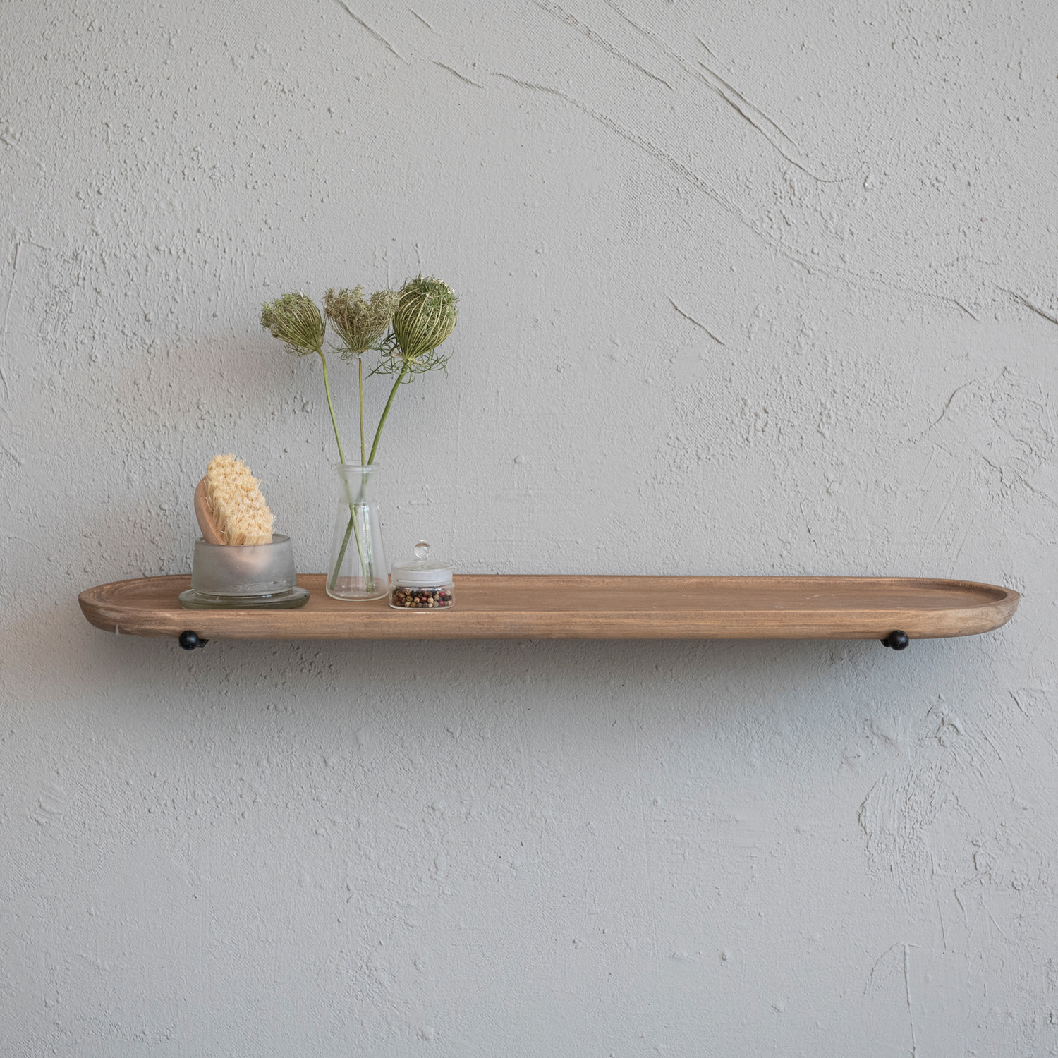 Our thoughtfully curated collection of wall shelves, baskets, and hooks features a wide array of designs that serve as a blank canvas for personal style, or as a functional accent. Display Choose from a vast array of materials from cast iron and reclaimed wood to handcrafted paper mache and stoneware, and styles from mid-century modern and classic farmhouse to vintage glam and contemporary boho. Effortlessly amplify a room's dimensions, stylishly organize odd and ends, conveniently access coats and jackets, express personal style, create a stylish focal point, or simply make the perfect design statement or unique addition to a gallery wall. This contemporary wood wall shelf features an elongated oval silhouette with a raised edge. Display in a living space of any style from farmhouse to industrial. Equipped with mounting hardware on back for easy hanging. Made from pine wood and iron.